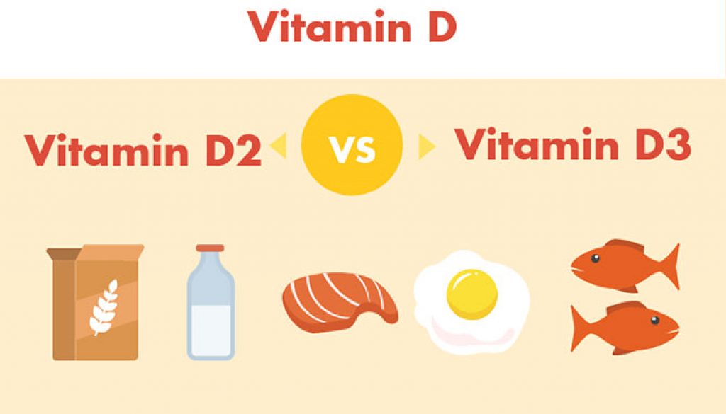 비타민 D2(ergocalciferol, 에르고칼시페롤)는 버섯에 들어 있는 식물성 비타민D 성분이며, 비타민 D3(cholecalciferol, 콜레칼시페롤)는 육류나 생선에 들어 있는 동물성 비타민D 성분입니다.