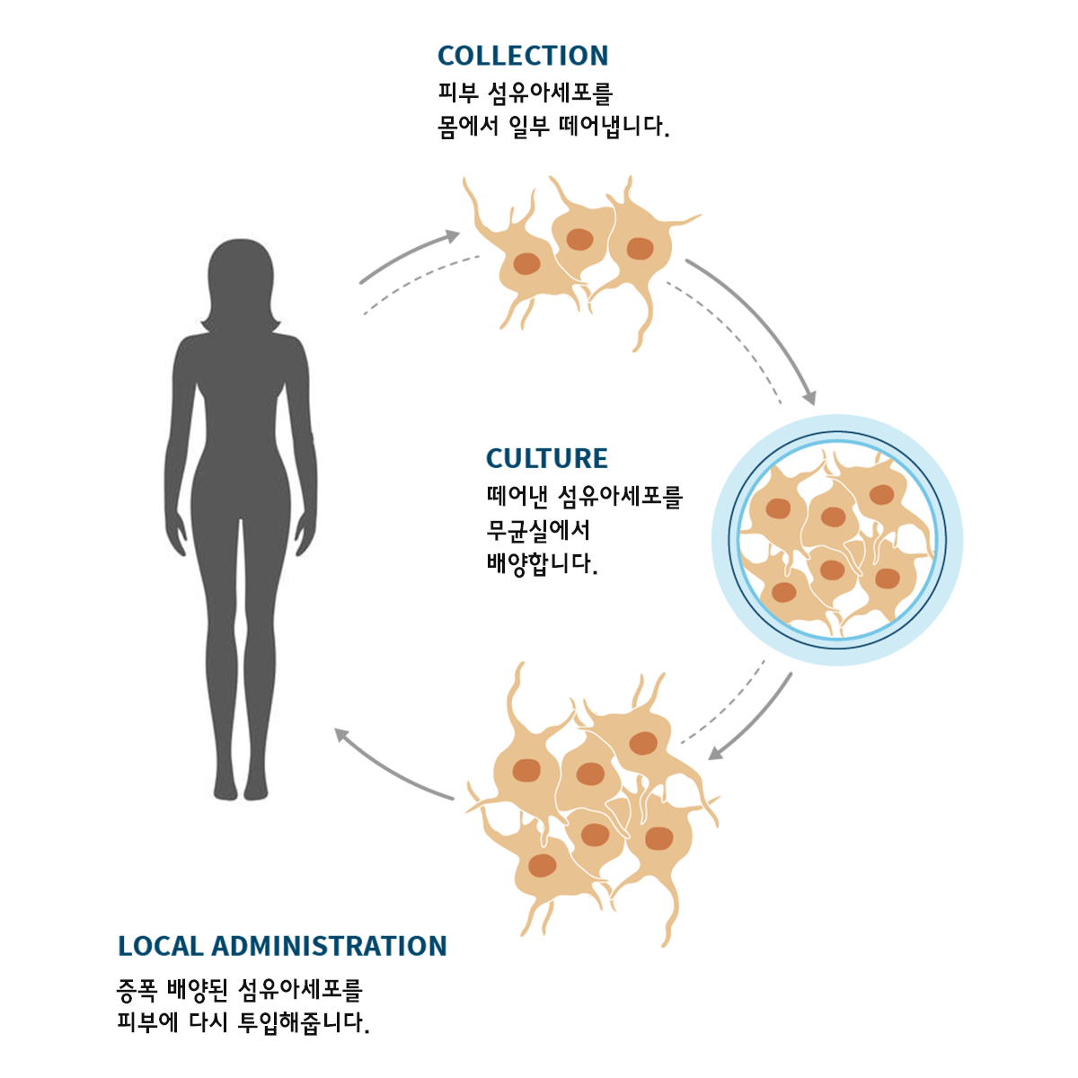 떼어낸 피부 속에서 섬유아세포를 분리한 후 적절한 환경에서 배양하여 1cm3 당 2 X 107 개체(이천만개) 이상으로 증폭시킨 후 다시 피부 주사로 얼굴 피부 전체에 고르게 이식합니다.