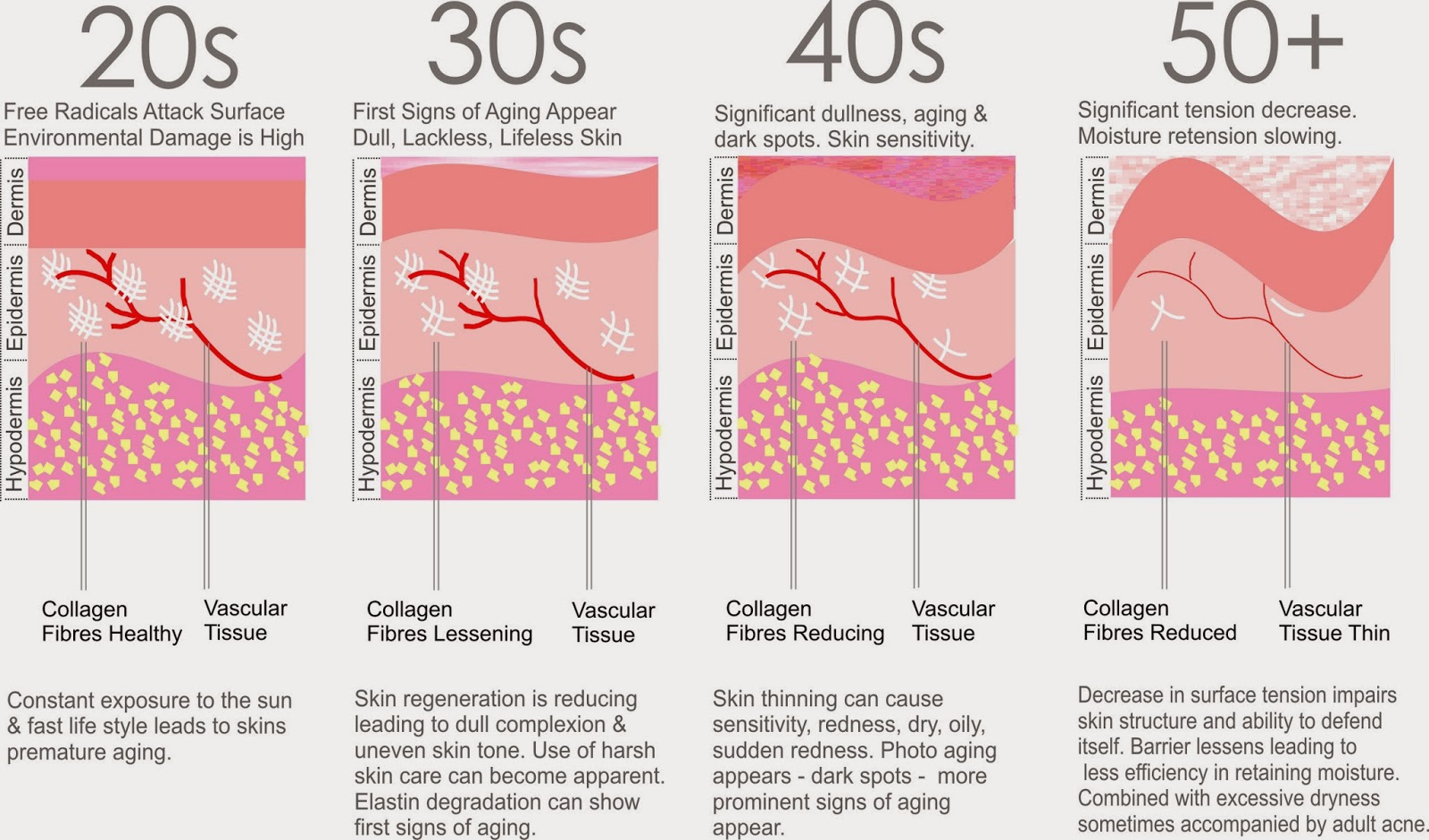 콜라겐은 특히 피부 진피(dermis)의 90%를 채우는 물질로, 노화에 따른 콜라겐의 질적 저하(손상)와 양적 저하(양이 줄어듬)는 얼굴 피부 탄력 저하, 자글자글한 주름, 넓은 모공, 살처짐, 피부가 얇아지고 위축되어 보이는 증상 등 다양한 피부 노화의 직접적인 원인이 됩니다.