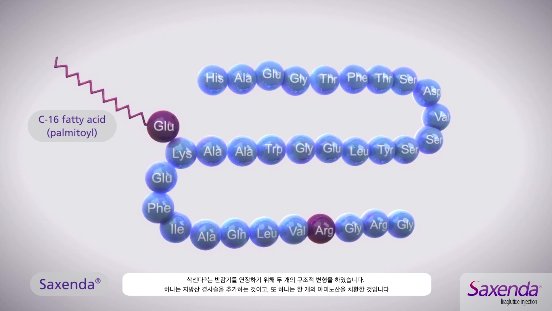 삭센다®는 반감기를 연장하기 위해 두 개의 구조적 변형을 하였습니다.
