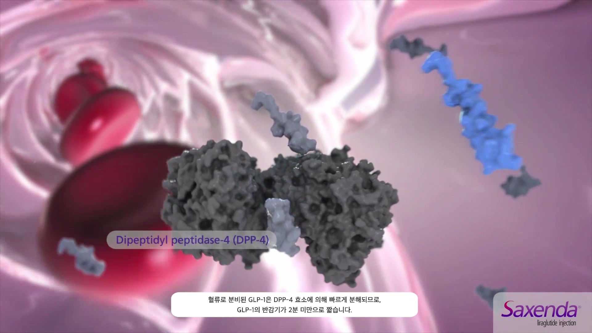 혈류로 분비된 GLP-1은 DPP-4효소(dipeptidyl peptidase-4)에 의해 빠르게 분해되므로, GLP-1의 반감기가 2분 미만으로 짧습니다.