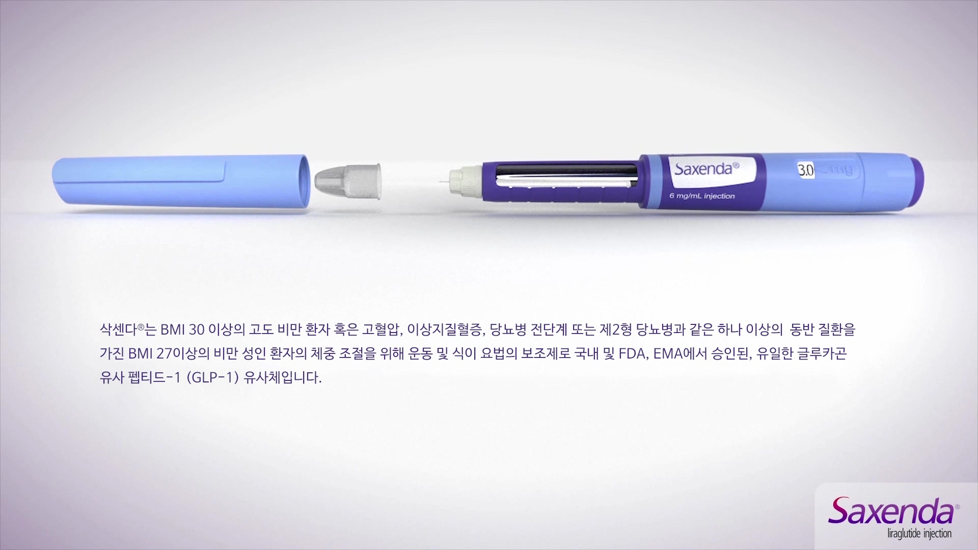 삭센다®는 BMI 30 이상의 고도 비만 환자 혹은 고혈압, 이상지질혈증, 당뇨병 전단계 또는 제2형 당뇨병과 같은 하나 이상의 동반 질환을 가진 BMI 27 이상의 비만 성인 환자의 체중 조절을 위해 운동 및 식이 요법의 보조제로 국내 및 FDA, EMA에서 승인된, 유일한 글루카곤 유사 펩티드-1 (GLP-1) 유사체입니다.