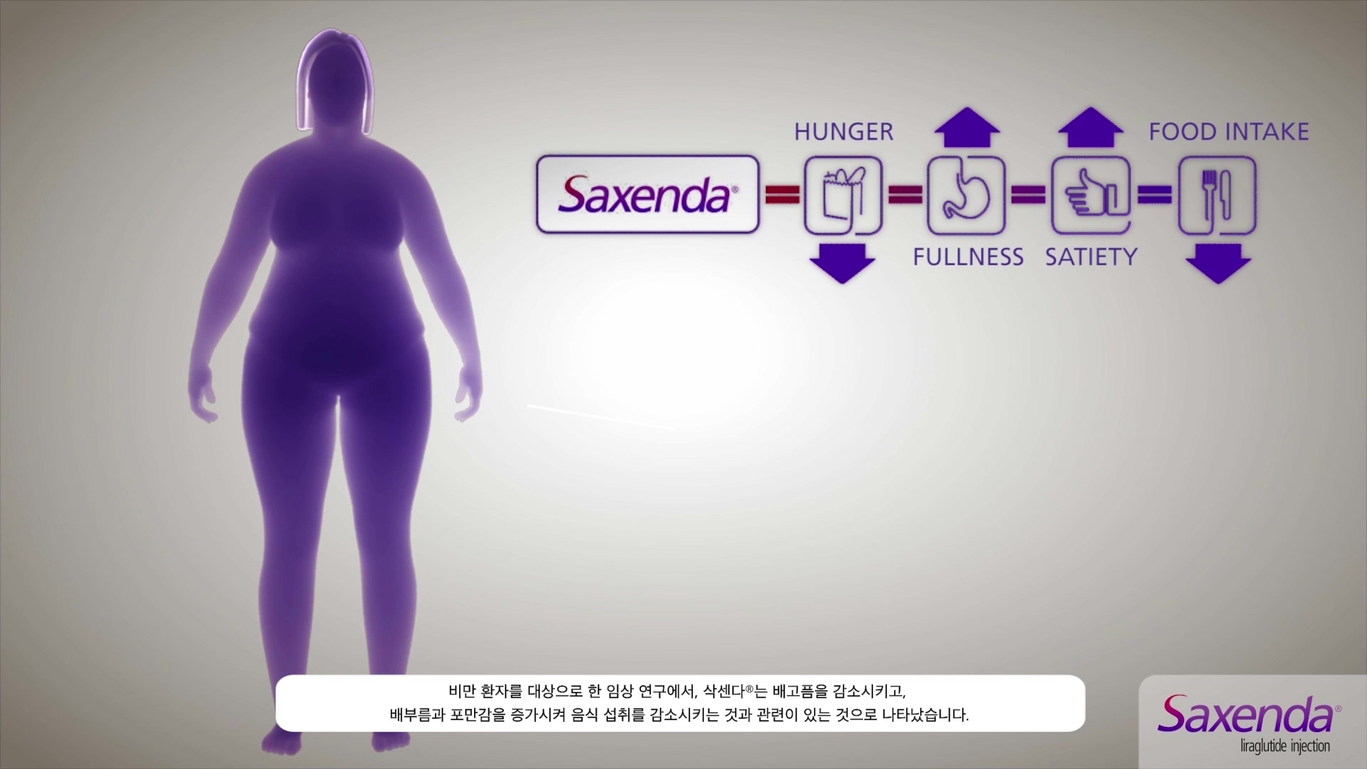 비만 환자를 대상으로 한 임상 연구에서, 삭센다®는 배고픔을 감소시키고, 배부름과 포만감을 증가시켜 음식 섭취를 감소시키는 것과 관련이 있는 것으로 나타났습니다.