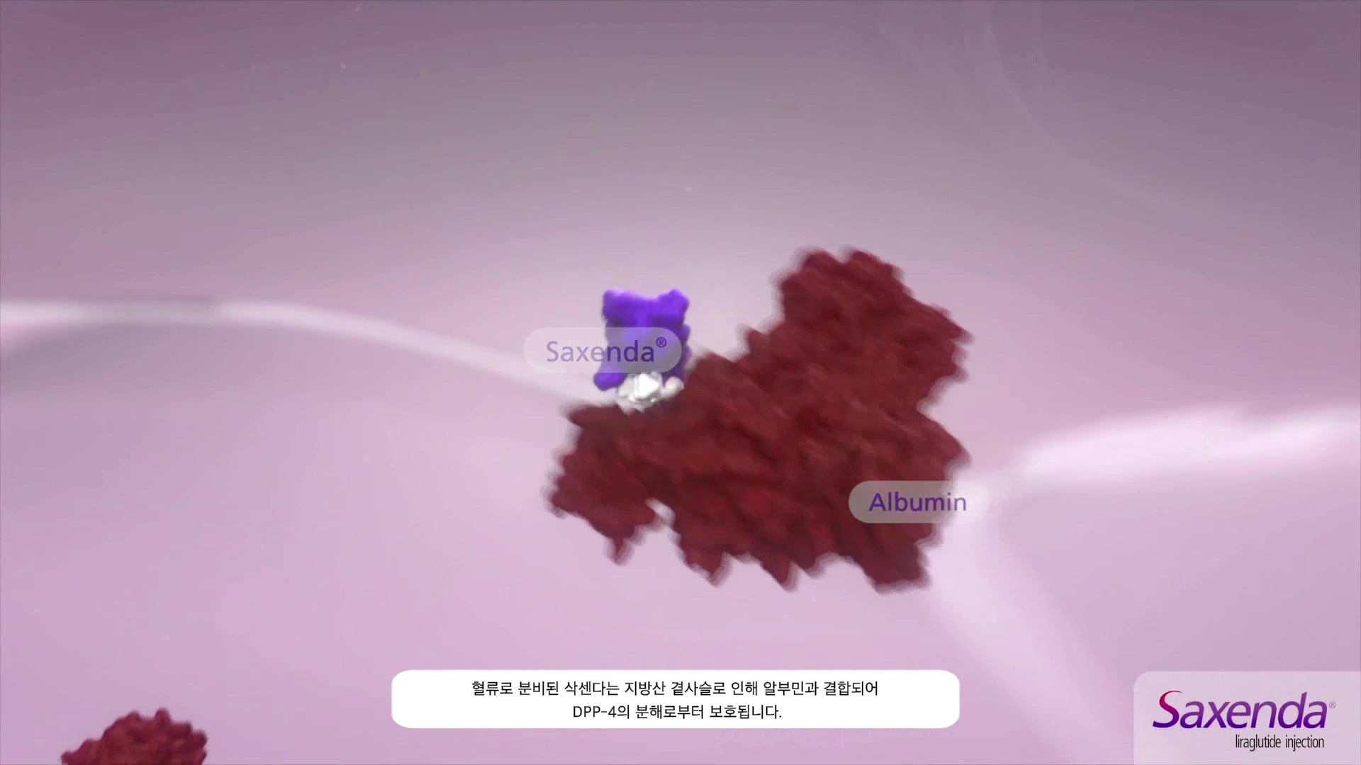 혈류로 분비된 삭센다®는 지방산 곁사슬로 인해 알부민과 결합되어 DPP-4의 분해로부터 보호됩니다.