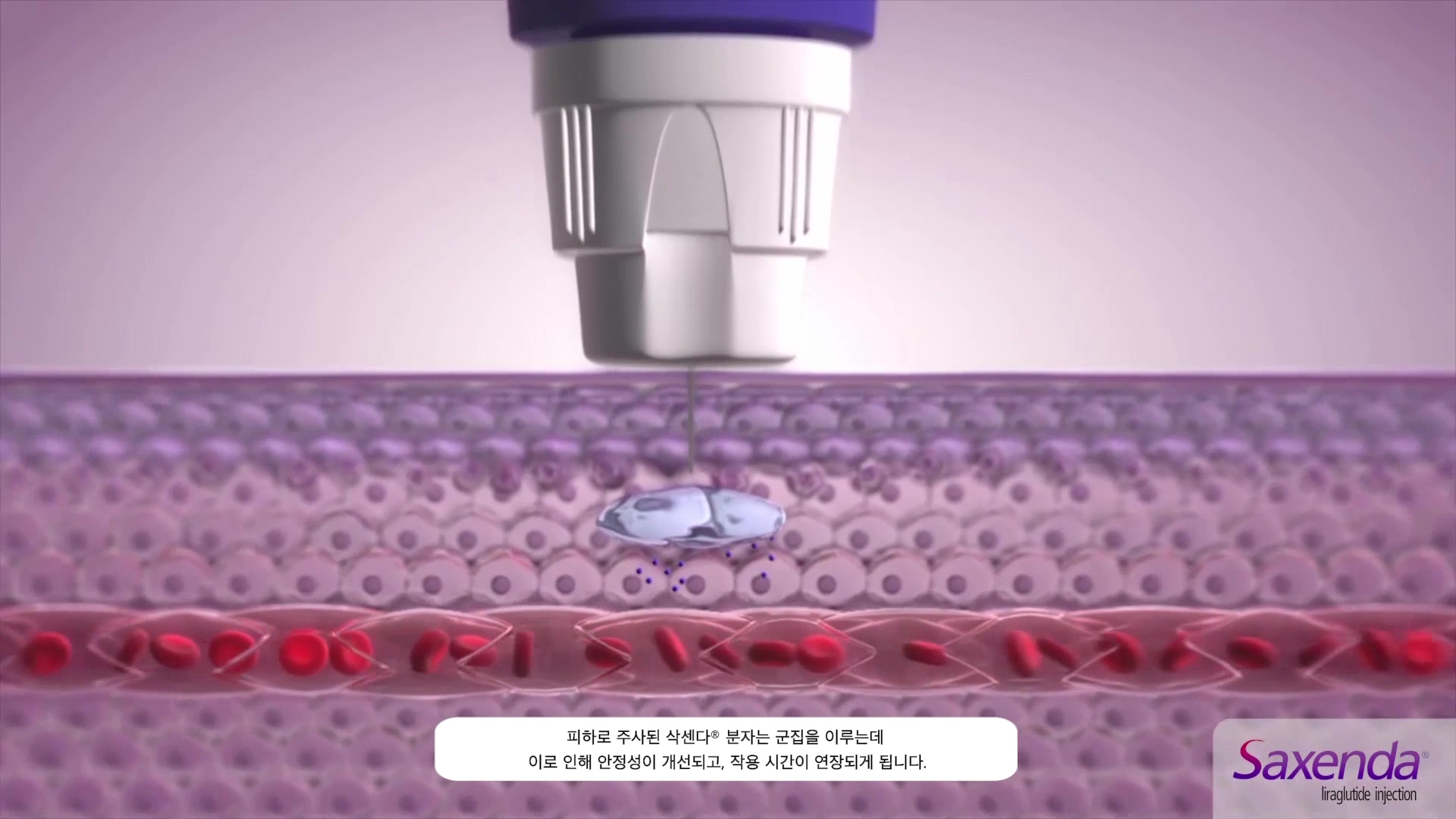 피하로 주사된 삭센다® 분자는 군집을 이루는데 이로 인해 안정성이 개선되고, 작용 시간이 연장되게 됩니다.