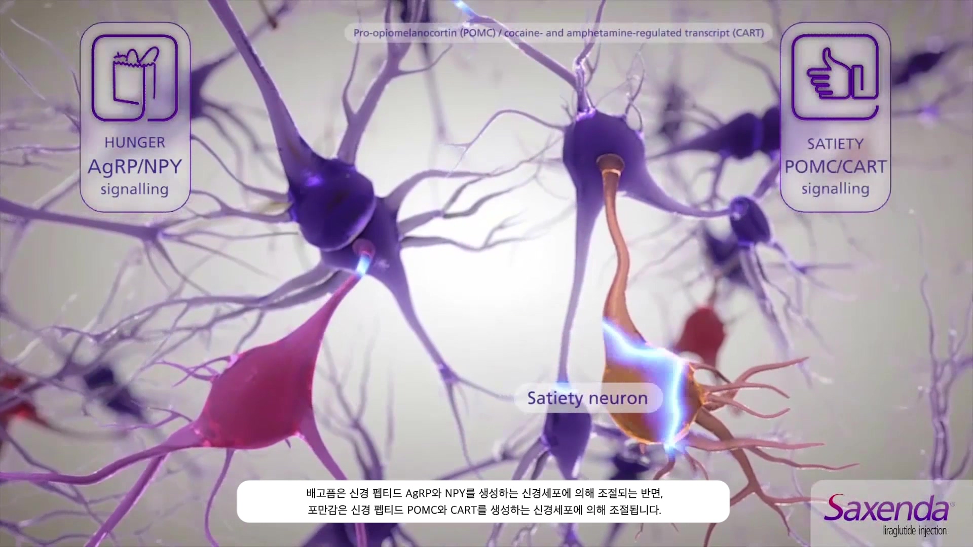 삭센다®는 AgRP/NPY 신경세포를 억제하여 배고픔을 덜 느끼게 하고, POMC/CART 신경세포를 자극하여 포만감을 증가시키도록 합니다.