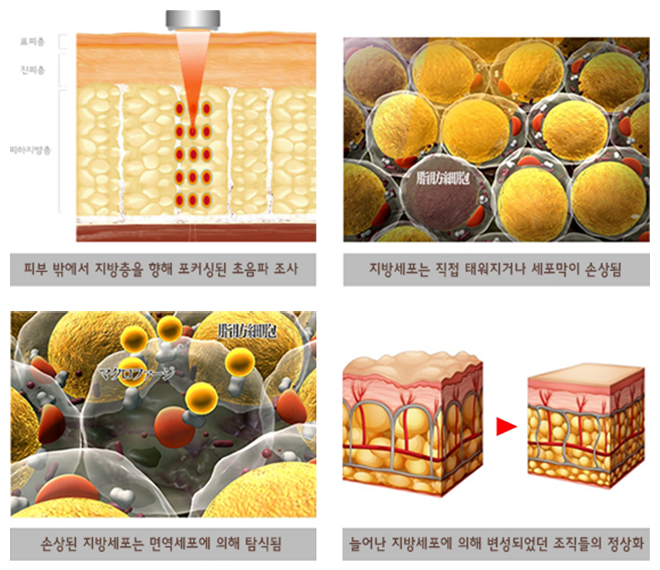 디커브 고온 지방제거술은 집적 초음파 원리로 고온 에너지를 일정 깊이에 쏘아 정교하고 매끄럽게 지방을 줄이는 효과가 좋습니다.