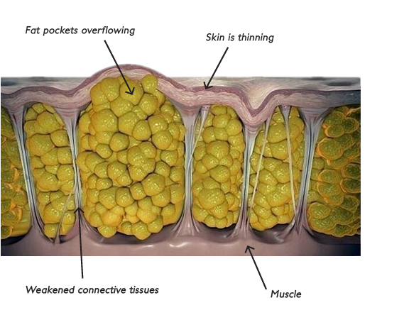 피하 지방 조직에는 단단하게 조직을 움켜 쥐는 듯한 모습의 섬유 기둥이 있는데, 이러한 질긴 섬유 기둥은 피하 지방 조직을 가로지르면서 피부와 근막을 연결하고 끌어당겨 팽팽하고 탄력 있게 바디 라인을 유지합니다.