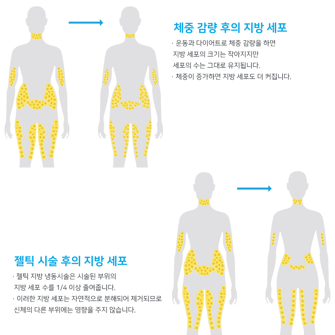 오리지널 젤틱은 믿을 수 있는 원리와 실제 눈에 띄는 지방 제거 효과(1회 치료로 시술 부위 지방의 25% 이상 제거)로 각국 식약처 승인을 취득하고, 이미 수 년 전부터 해외와 국내에서 활발히 시술되고 있습니다.